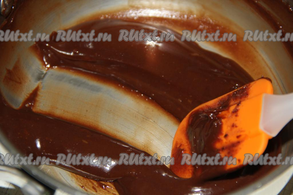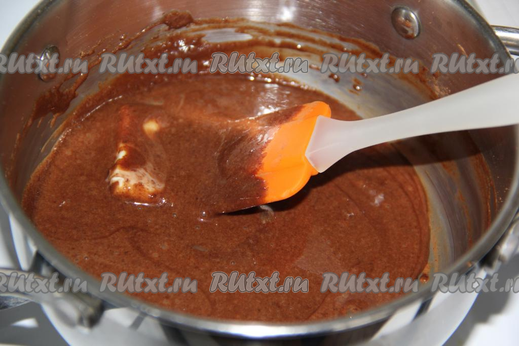 Масса постепенно начнёт загустевать. Проверить готовность можно следующим образом: если вы проведёте по дну сотейника лопаткой, то у вас останется след и масса не будет стекать. Готовую массу снять с огня.