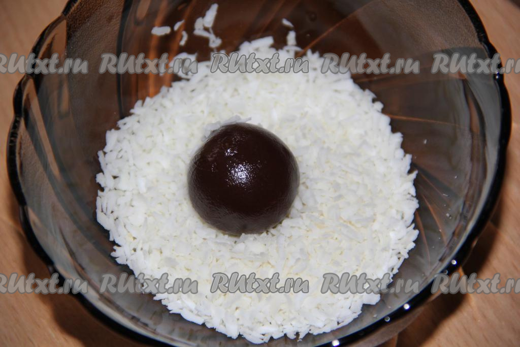 Холодную массу набирать ложкой и формировать круглые конфеты размером с грецкий орех. Выложить бригадейро в кокосовую стружку.