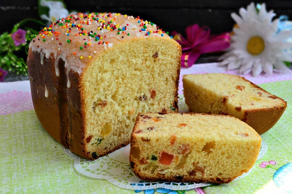 Для приготовления глазури соединить лимонный сок и сахарную пудру перемешать. Глазурь должна стать однородной. Пока кулич еще горячий, покрыть его глазурью, посыпать цветной посыпкой. Замечательному, ароматному, очень вкусному пасхальному куличу, приготовленному в хлебопечке, дать полностью остыть и можно разрезать.
