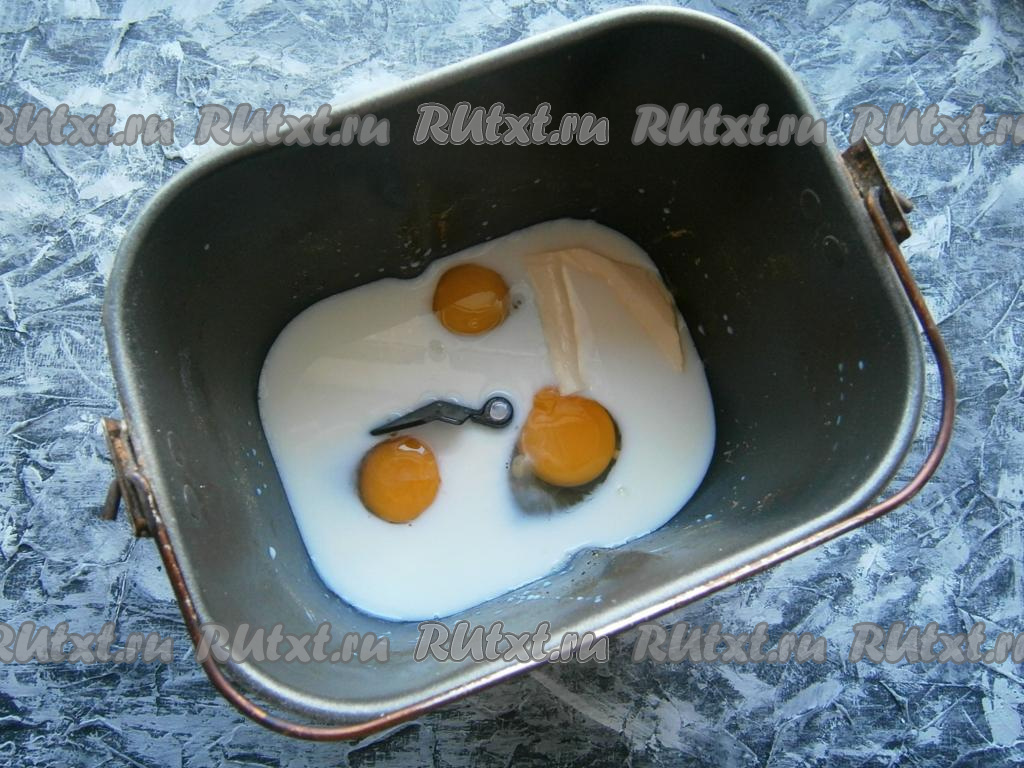 Тёплое молоко налить в ведерко хлебопечки, затем добавить сырые яйца комнатной температуры и размягченное сливочное масло, немного перемешать.