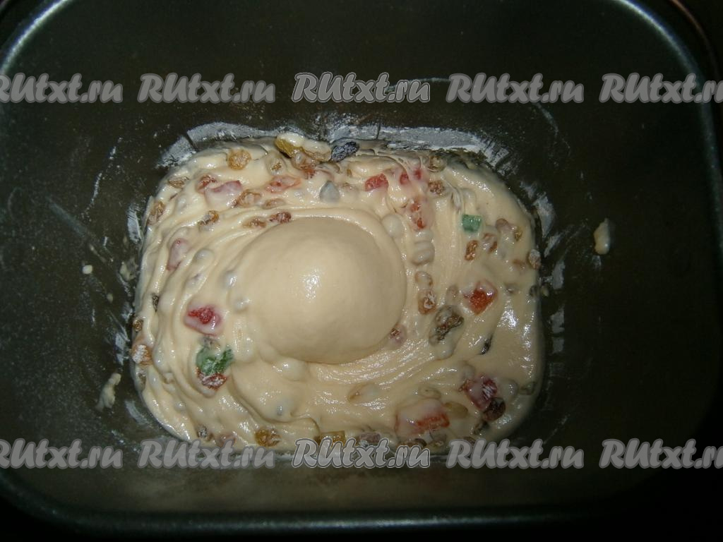 После специального сигнала добавить в тесто изюм с цукатами. Само тесто будет достаточно жидким - так и должно быть. Закрыть крышку хлебопечки и пусть пасхальный кулич выпекается до окончания режима.