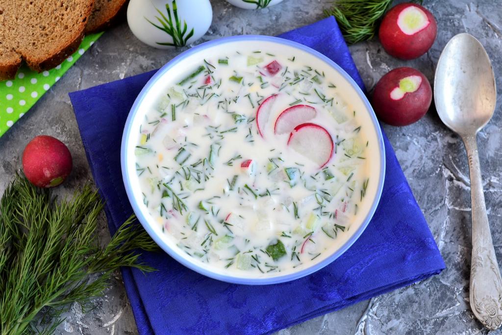 Дать окрошке охладиться в холодильнике хотя бы 1 час.