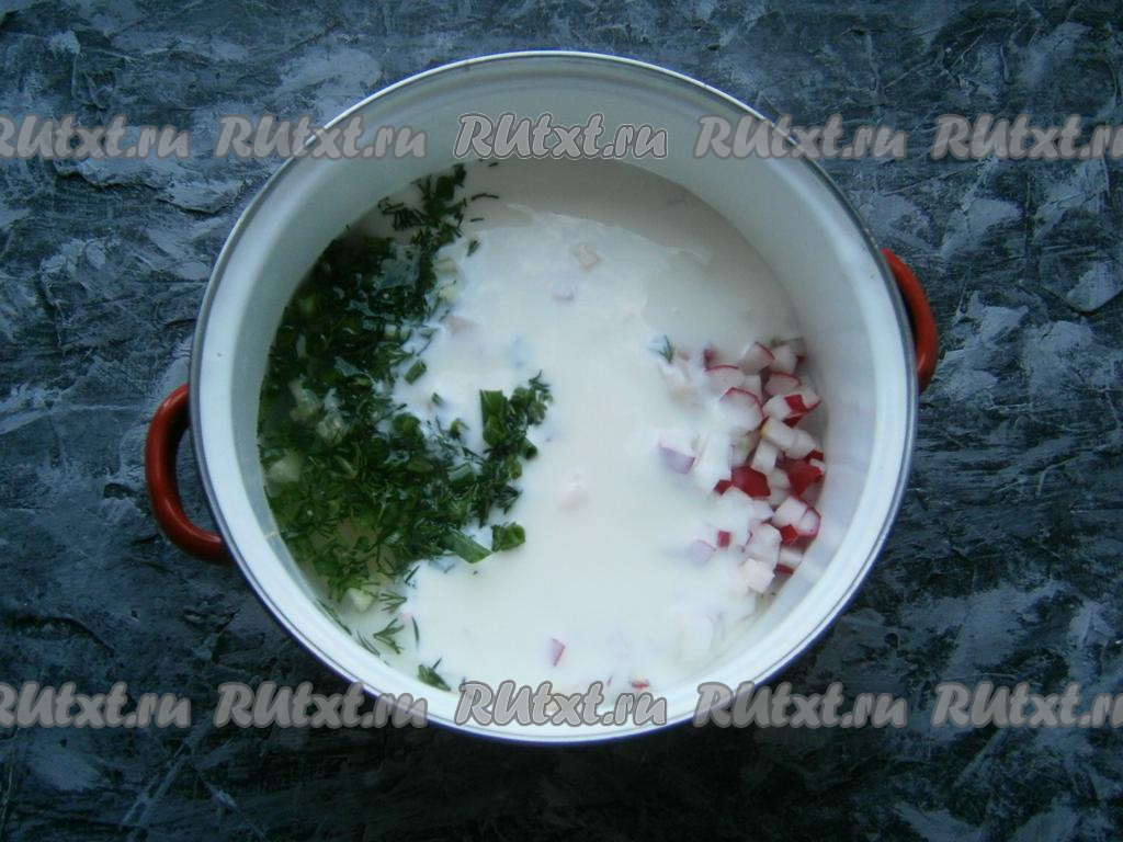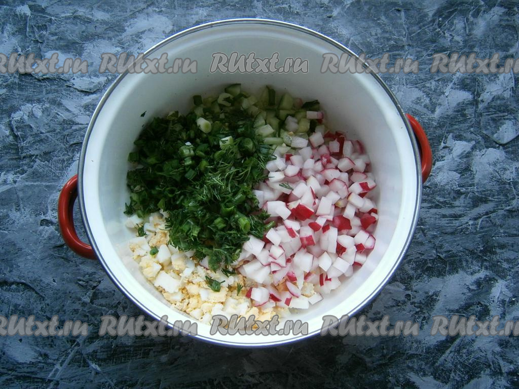 Сюда же добавить измельченный укроп и зеленый лук, а также нарезанный кубиками редис.