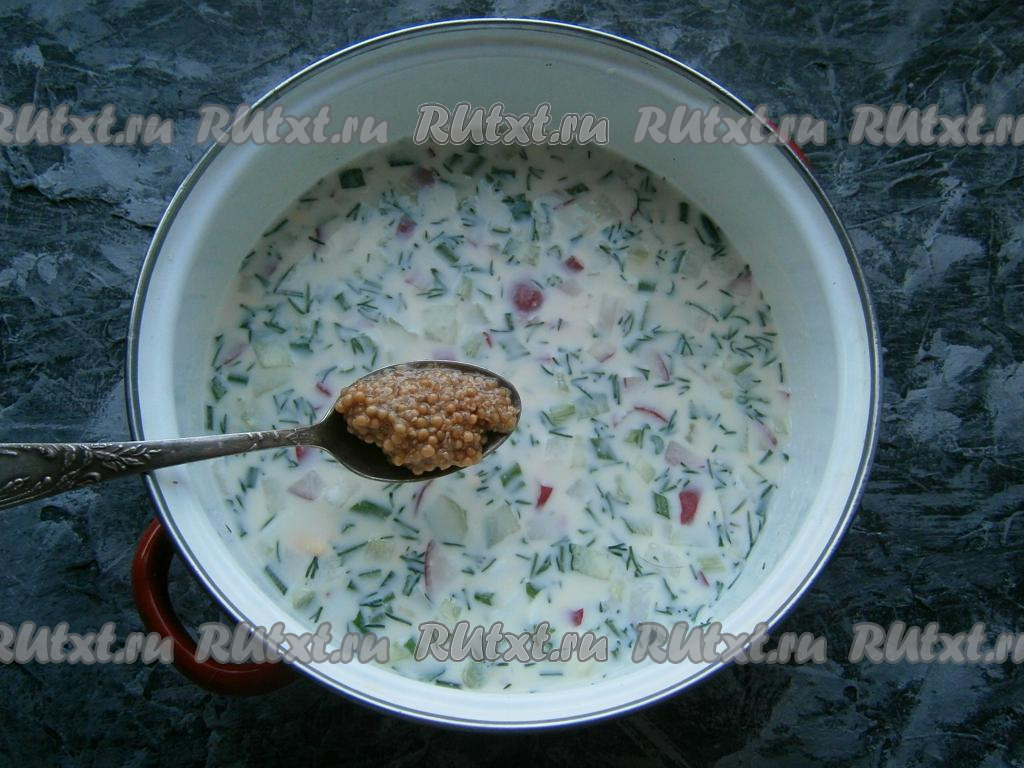 Окрошку посолить, добавить французскую горчицу, перемешать.
