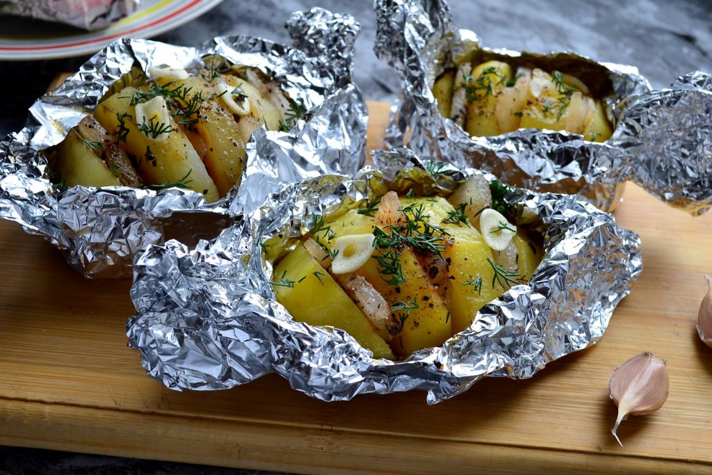 Запекать картофель с салом в разогретой духовке при температуре 190-200 градусов около 50 минут. Затем верх фольги аккуратно развернуть, посыпать картошку тонкими кружочками (или кусочками) чеснока и зеленью укропа.