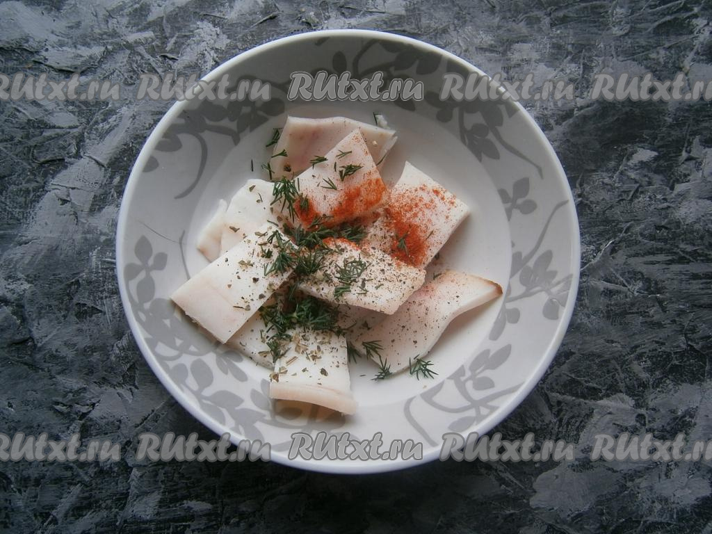 Сало нарезать тонкими ломтиками, перемешать его с черным молотым перцем, перцем чили, паприкой, базиликом и щепоткой измельченной зелени укропа.