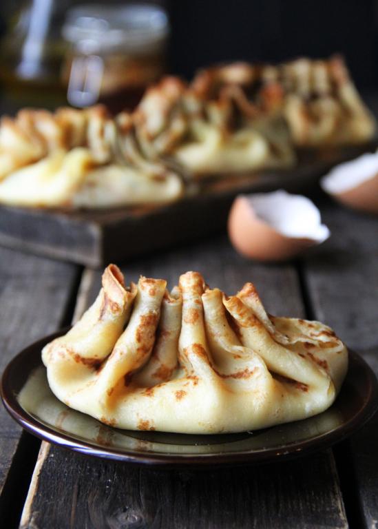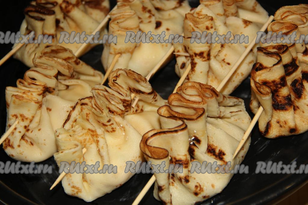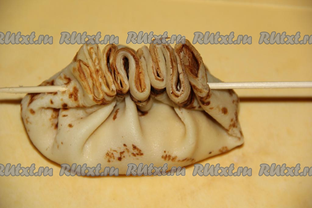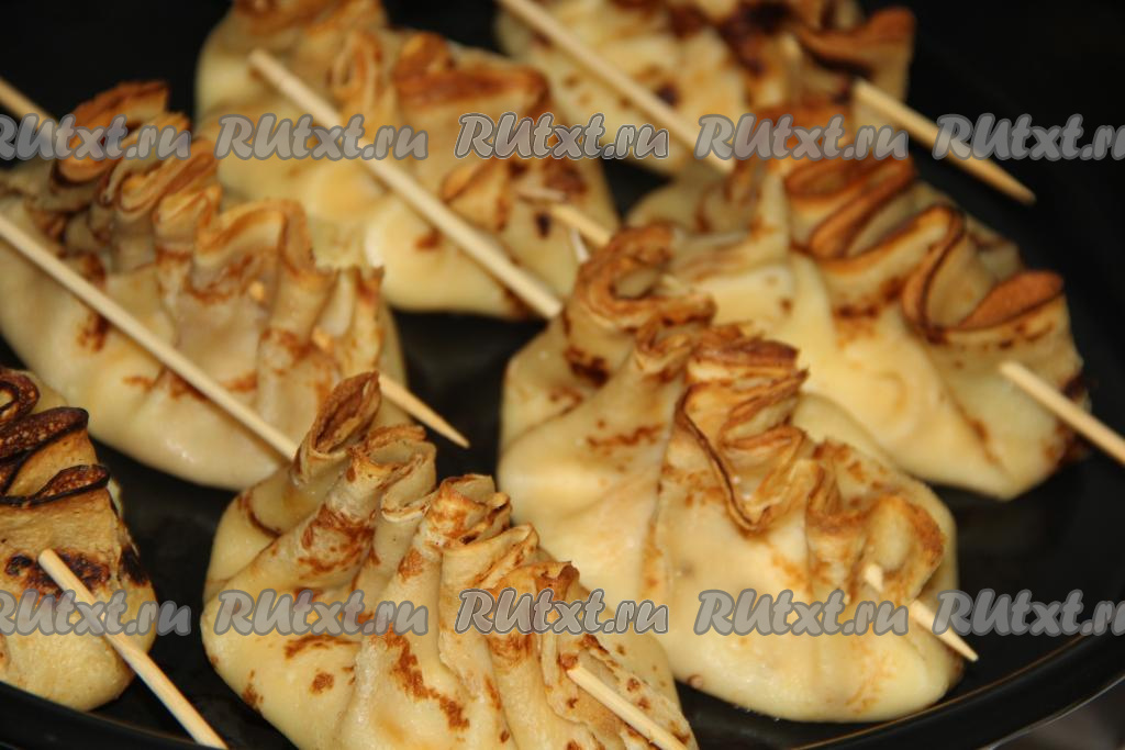 Сложить блинчик пополам и совместить края. Собрать края в гармошку и проколоть деревянной шпажкой (как на фото).