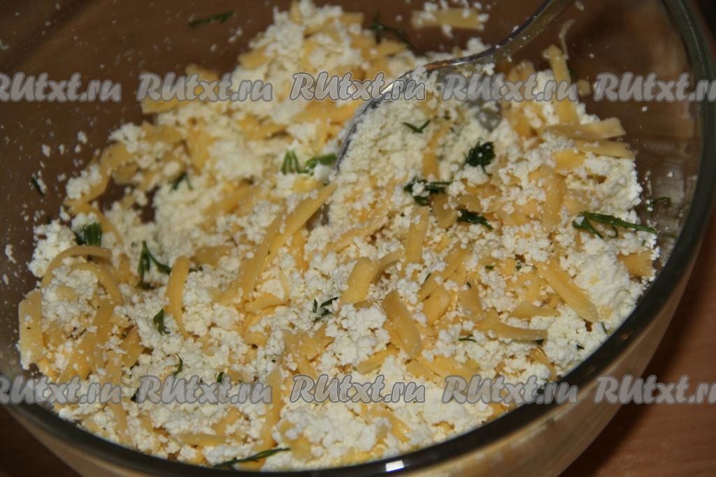 Хорошо перемешать творог, зелень, сыр и начинка для блинов готова.