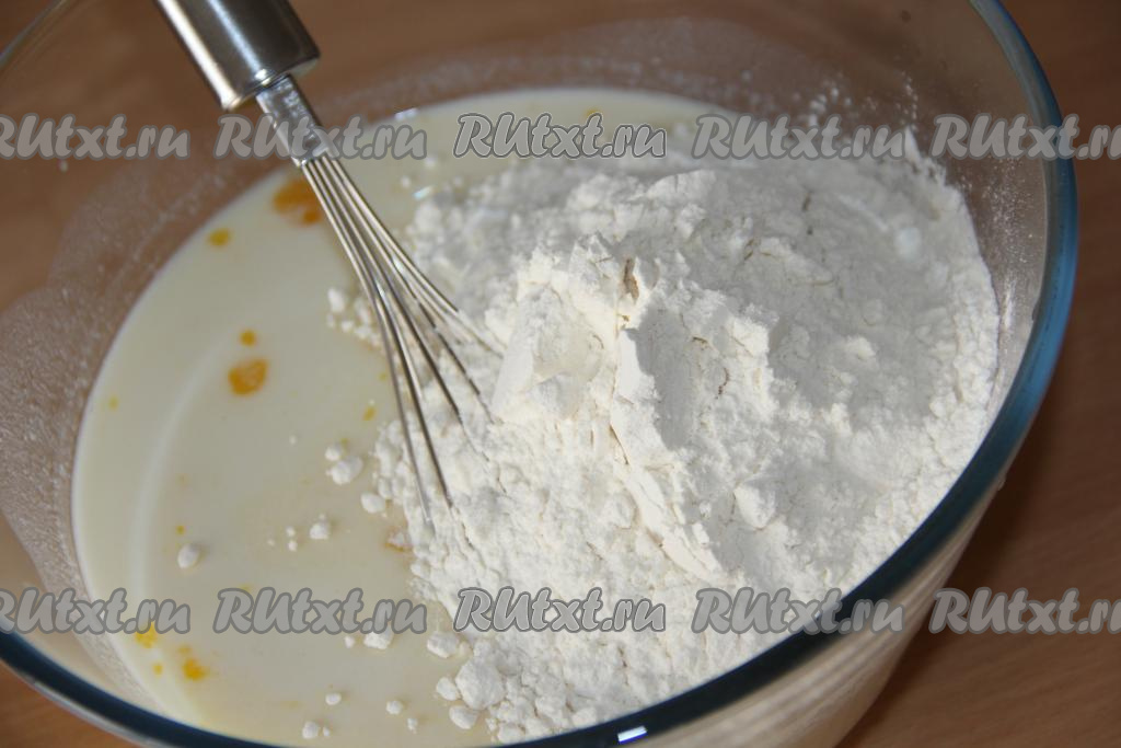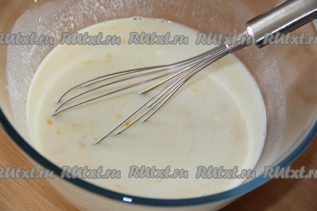 Для приготовления блинного теста нужно соединить молоко, яйца, соль и сахар, слегка перемешать.