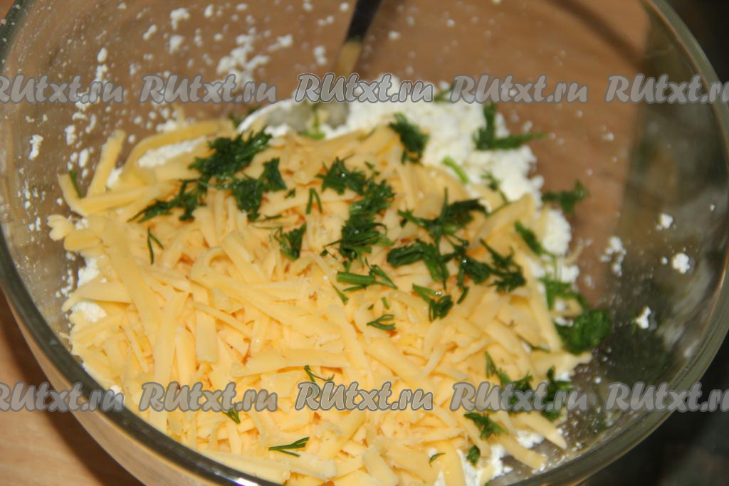 Зелень (я готовила с укропом) вымыть, обсушить, а затем мелко нарезать и добавить к творогу и сыру.