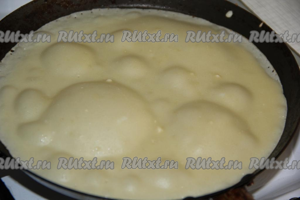 Раскалить сковороду, налить немного теста, равномерно распределить. Я смазала сковороду только перед первым блином. Жарить блинчик на среднем огне вначале с одной стороны до румяного цвета, затем перевернуть и жарить до румяности с другой стороны. Таким образом приготовить все блины. Готовые блинчики складывать на тарелку.