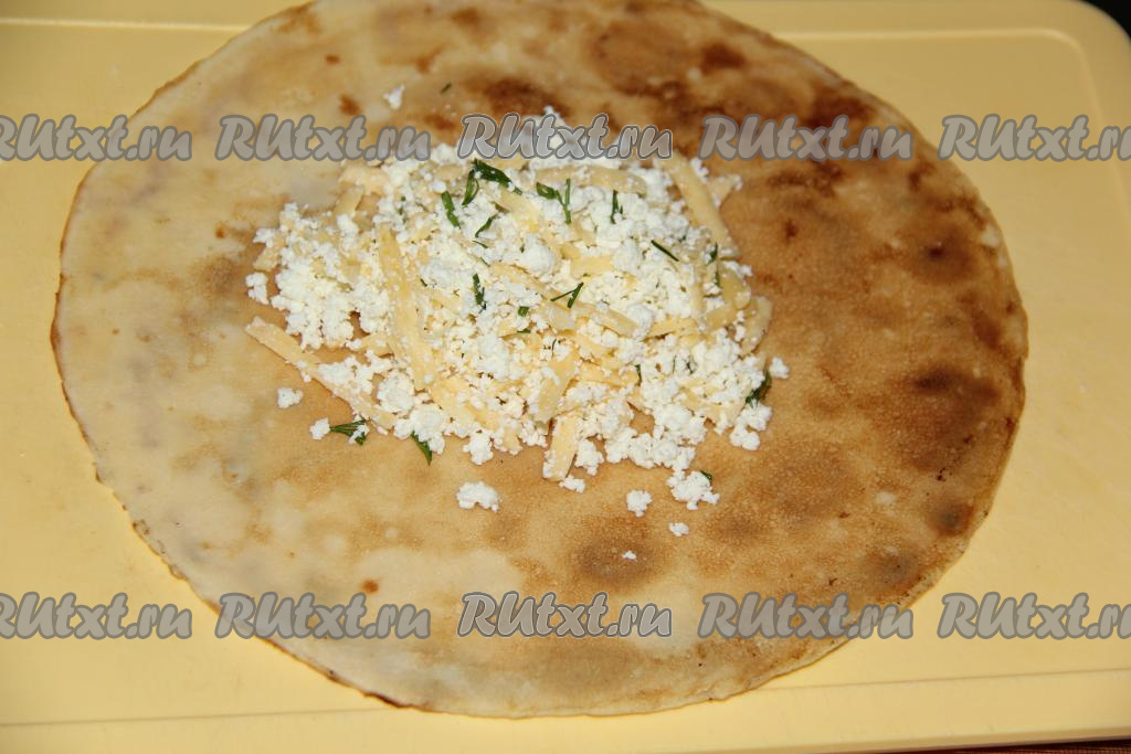 На каждый блин выложить 2 столовые ложки творожно-сырной начинки.