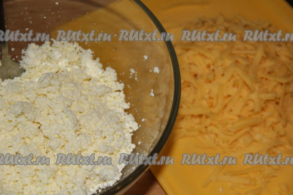 Для приготовления начинки творог насыпать в миску. Сыр натереть на крупной тёрке и выложить к творогу.
