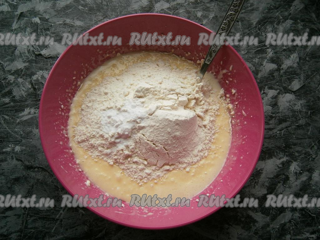 Еще раз взбить массу миксером и всыпать муку с содой.