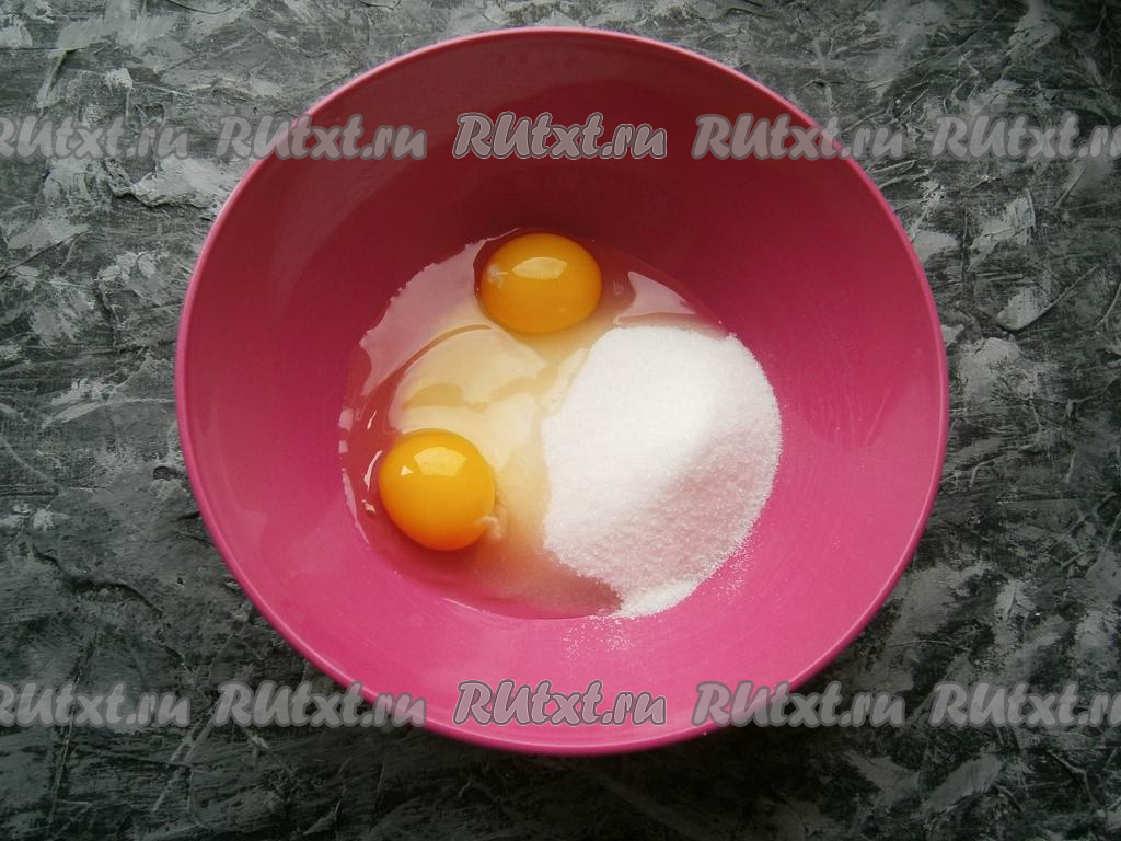 Взбить миксером яйца с ванилином и сахаром до плотной, светлой и пышной массы (минуты 3-4), влить растительное масло и добавить размягченное сливочное масло.