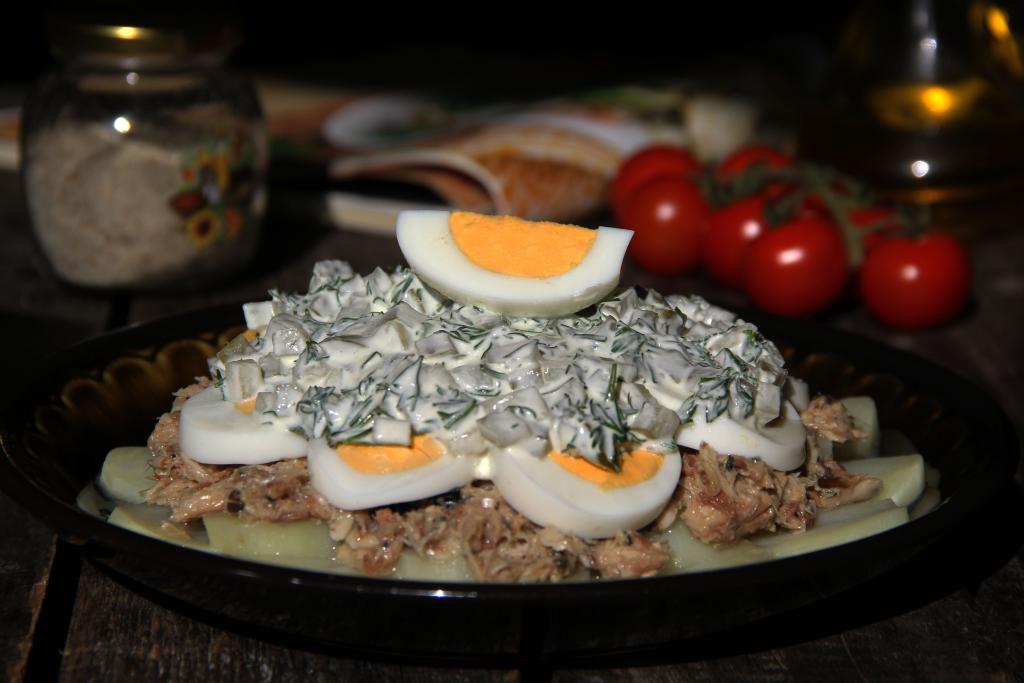 Подать аппетитный, пикантный салат, приготовленный из консервированной скумбрии с картофелем и яйцами, к столу. В этом блюде достаточно крупные кусочки, поэтому этот салатик похож и на закуску. Очень вкусный салат, попробуйте!
