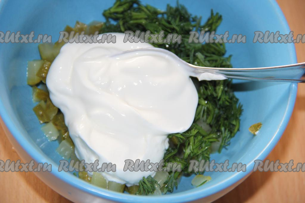Для приготовления заправки маринованный огурчик мелко нарезать (можно натереть на крупной тёрке).