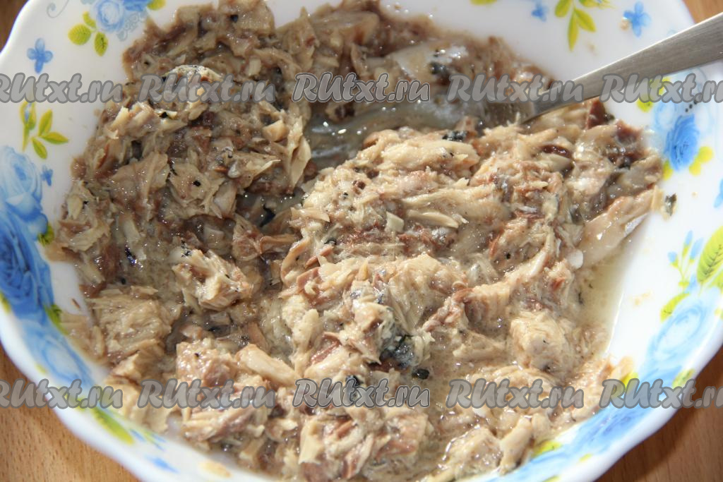 Вилкой размять скумбрию в однородную массу.