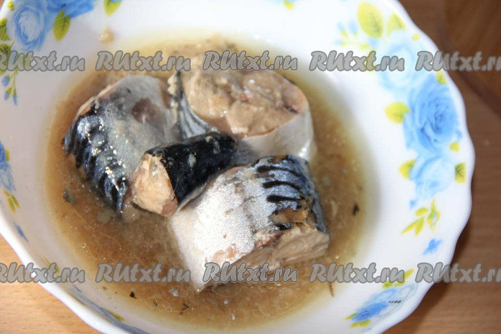 Открыть банку с консервированной скумбрией, выложить рыбу в миску вместе с соком.