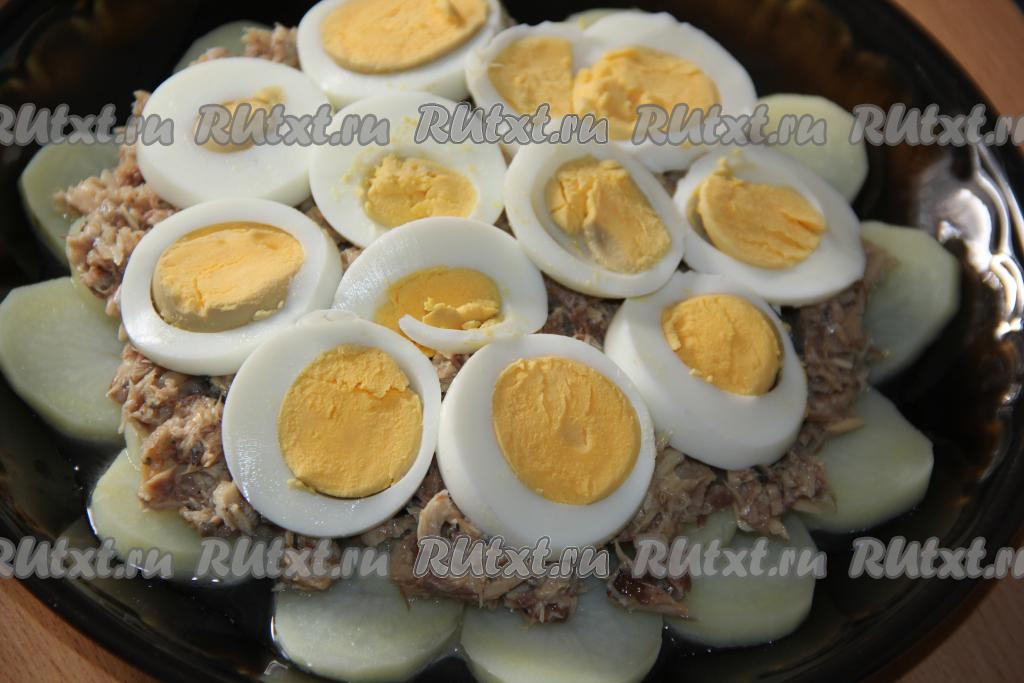 Сварить яйца (в течение минут 10 с момента закипания воды), затем очистить от скорлупы и нарезать кружочками толщиной 1 см. Выложить кружочки яиц поверх рыбы.