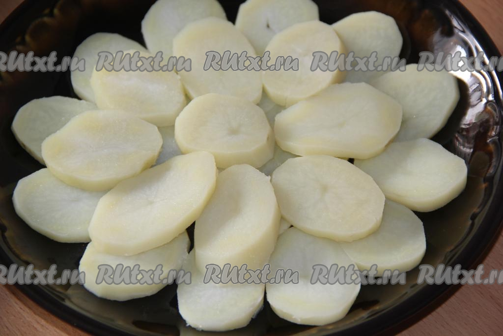 Картофель предварительно сварить в мундире, остудить, затем очистить, нарезать кружочками толщиной, примерно, 1 см. Выложить картофель на тарелку в 1 или 2 слоя.