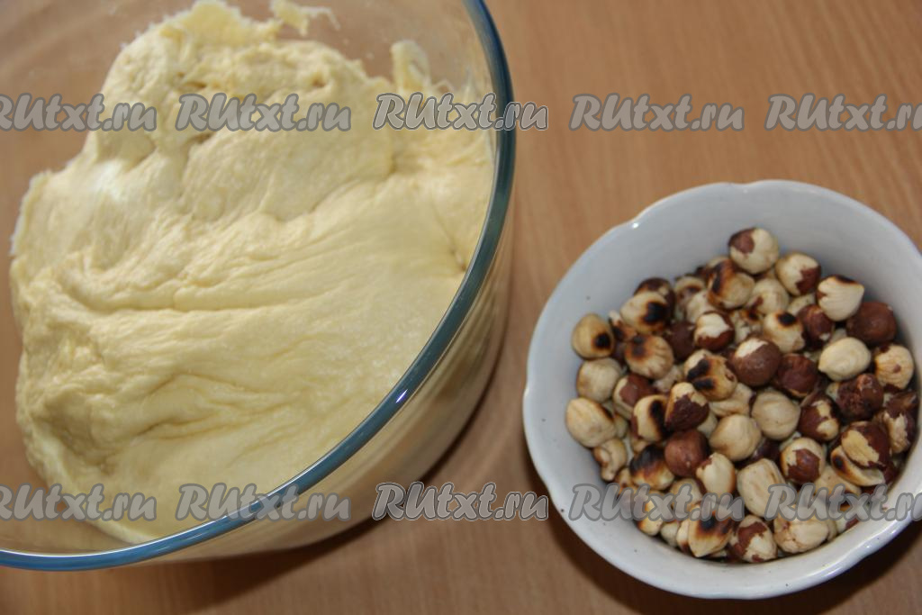 Хорошо обмять тесто, добавить орехи (можно добавить сухофрукты или цукаты). Я предварительно обжарила фундук на сухой сковороде и очистила от шелухи.