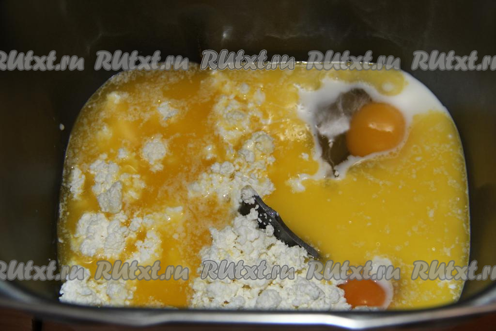 Для замешивания теста в хлебопечке нужно в ведёрко влить теплое молоко, добавить яйца.
