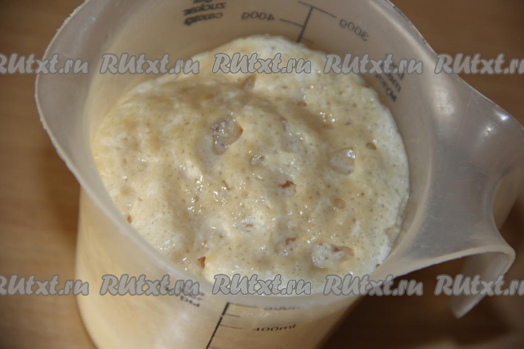 В тёплое молоко (температура молока не должна быть выше 40 градусов) всыпать дрожжи и 1 столовую ложку сахара, оставить опару на 15 минут в тепле. За это время на поверхности молока должна образоваться пышная "шапка".