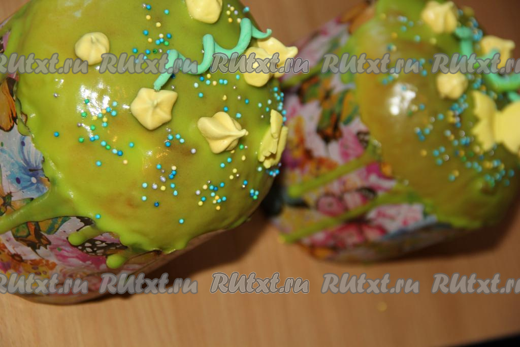 Готовые куличи полностью остудить, а затем покрыть глазурью (я использовала покупную сахарную глазурь, приготовив её по инструкции) и украсить на своё усмотрение.