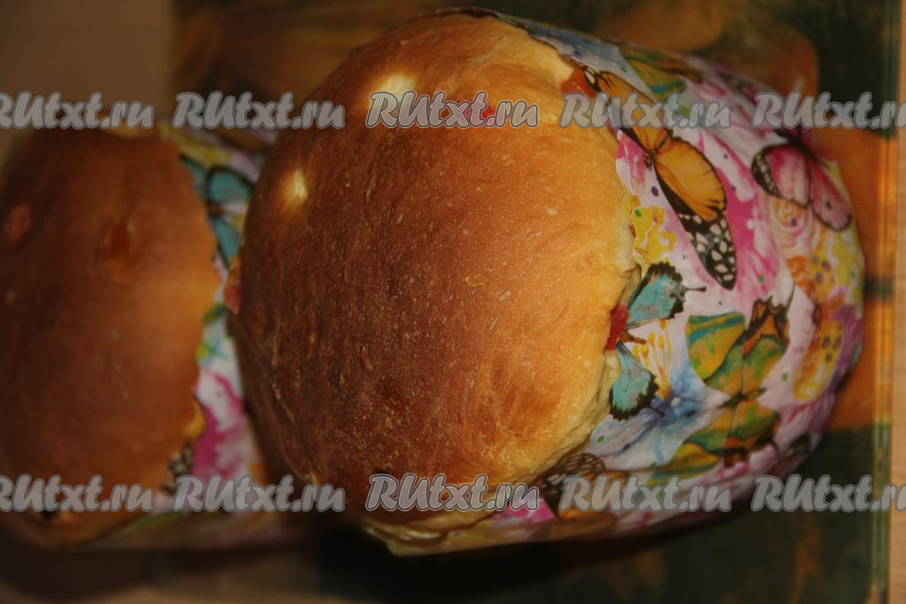 Выпекать куличи в разогретой духовке минут 40-45 при температуре 200 градусов. Готовность можно проверить с помощью деревянной шпажкой (шпажка останется сухой при прокалывании готового кулича).