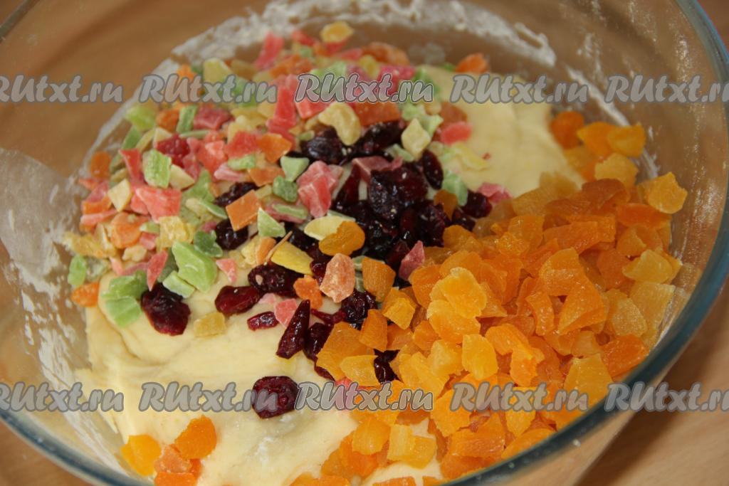 Хорошо обмять тесто, добавить цукаты (я добавила изюм, курагу и вяленую клюкву).