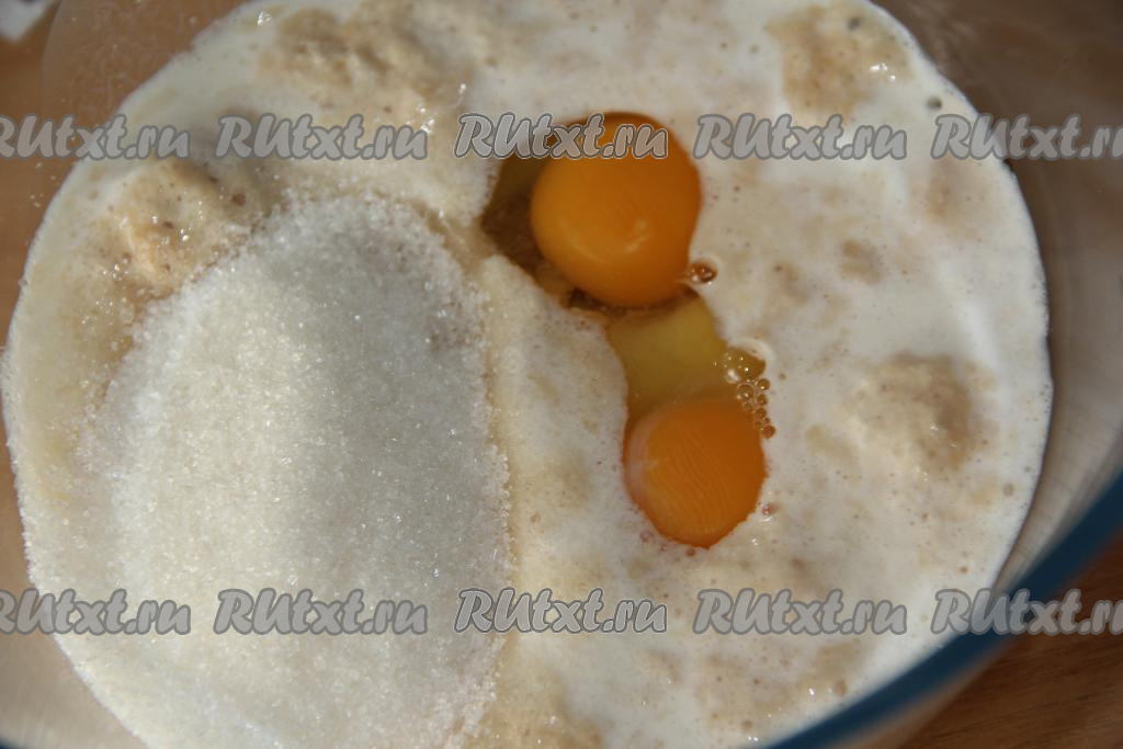 В глубокую миску влить опару, добавить яйца комнатной температуры, ванильный сахар и оставшийся сахар.