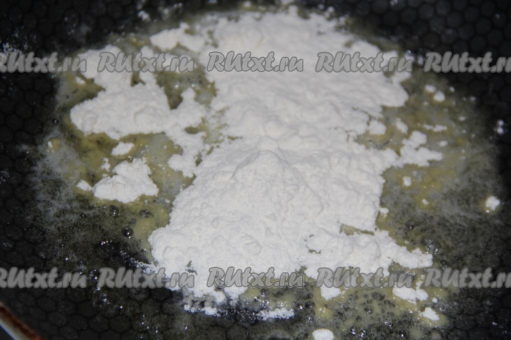 Муку добавить в растопленное масло и обжарить, помешивая, на небольшом огне до золотистого цвета.