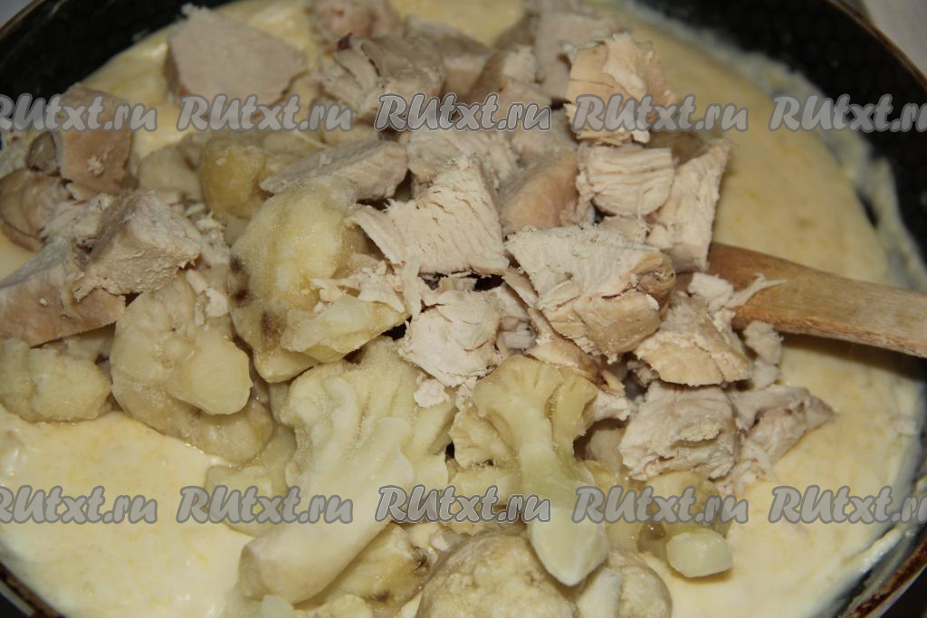 Потомить соус 2-3 минуты на медленном огне (до однородности), снять с огня. Затем в соус выложить соцветия замороженной (или свежей) цветной капусты и кусочки варёной грудки, перемешать.