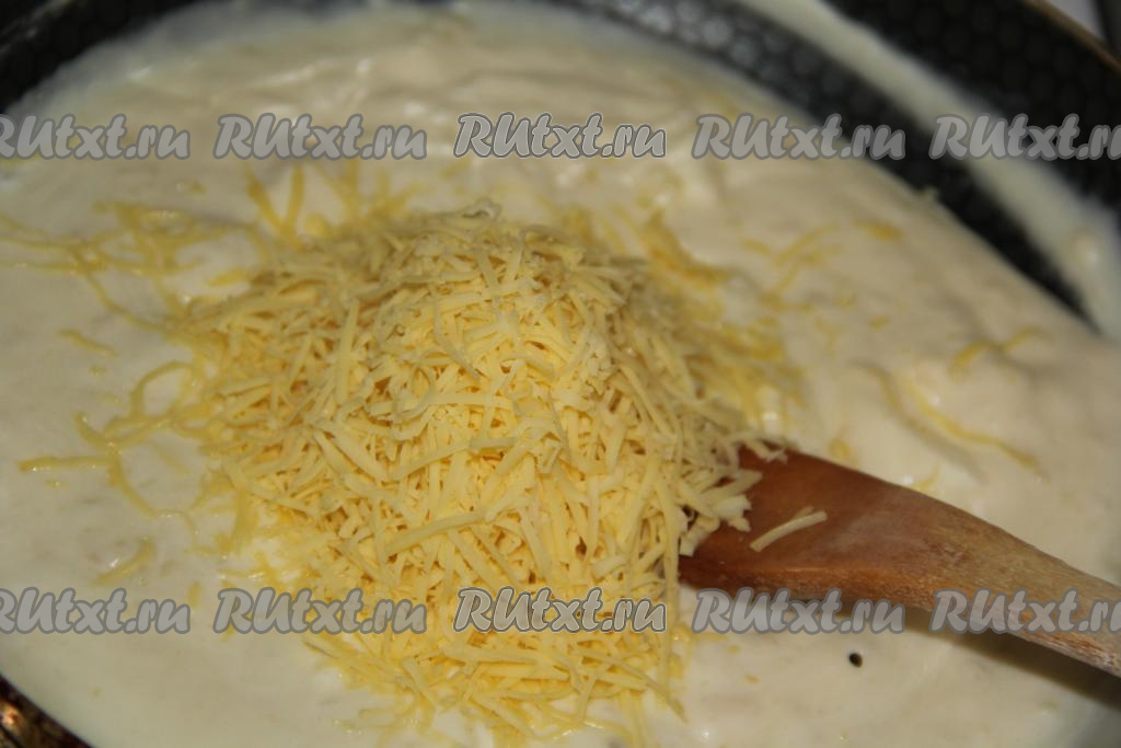 Затем в получившийся соус выложить твердый сыр, натертый на мелкой тёрке, перемешать.