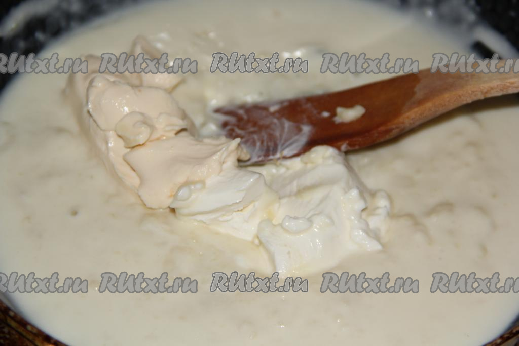 Добавить в сковороду творожный (или плавленный) сыр, перемешать.