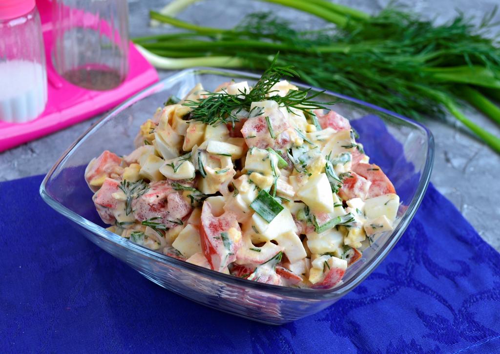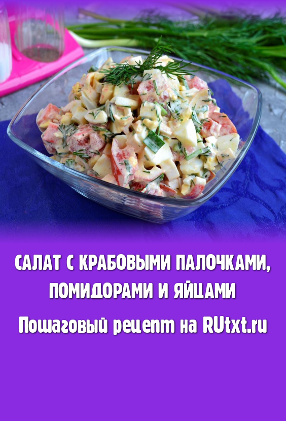 Предлагаю вам попробовать очень вкусный салат, приготовленный с крабовыми палочками, помидорами и яйцами. Салатик подойдет и для ужина, и для праздничного стола. Это легкое, свежее, вкусное блюдо непременно понравится и вам, и вашим родным, и гостям. Единственное условие - крабовые палочки должны быть хорошего качества и от проверенного производителя, именно от них зависит вкус этого салата.
