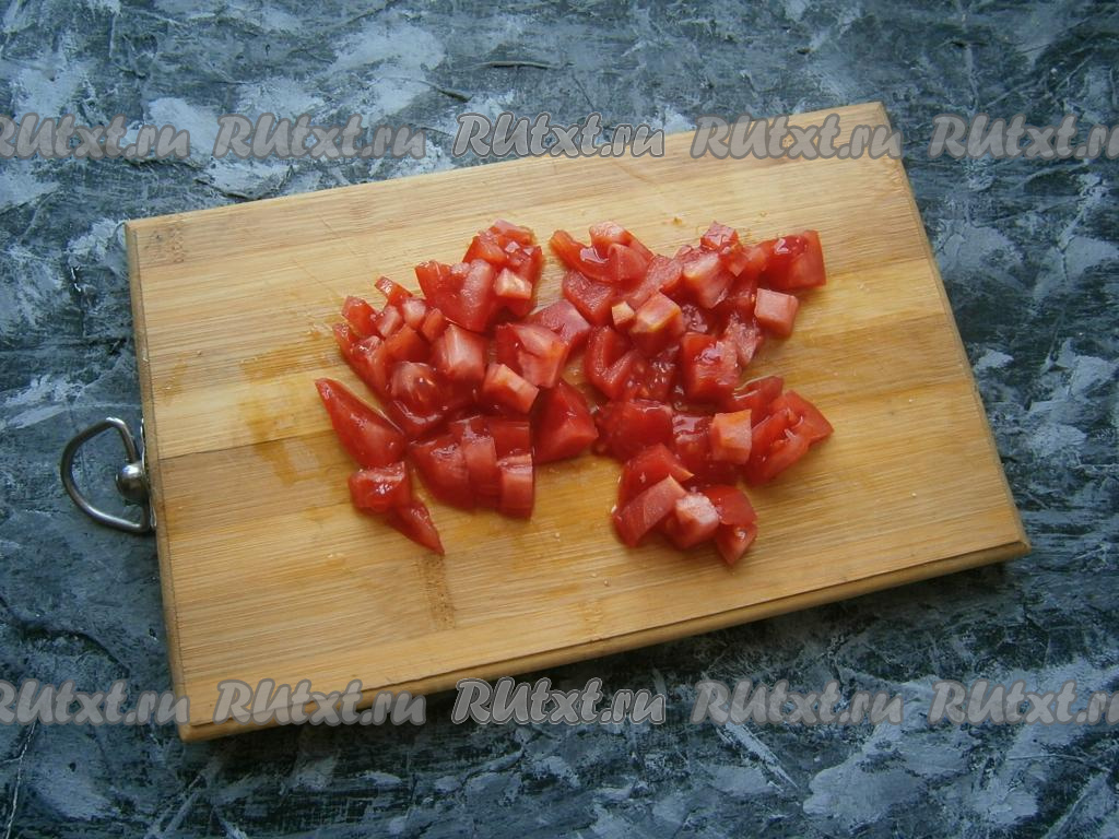 Свежие помидоры для этого салата нужно нарезать на небольшие кубики.