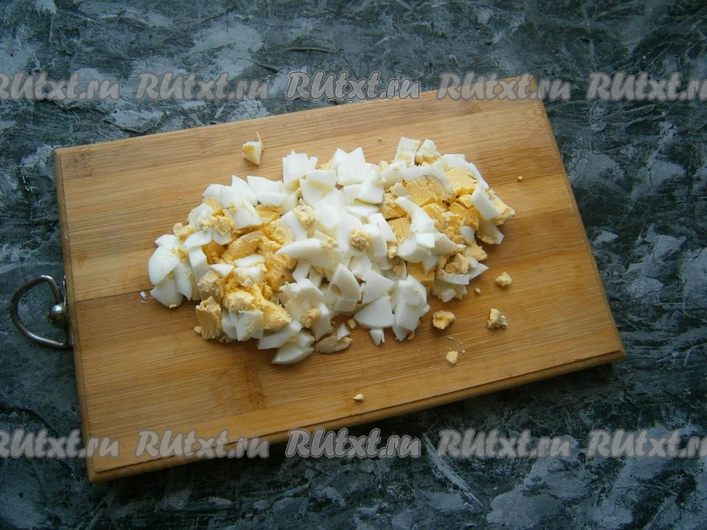 Вареные яйца очистить от скорлупы и порубить ножом.