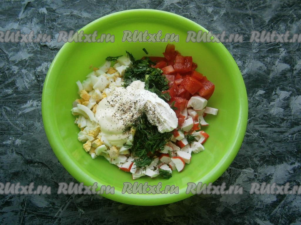 Сложить крабовые палочки, зелень, яйца и помидоры в миску, добавить соль, майонез и свежемолотый черный перец.
