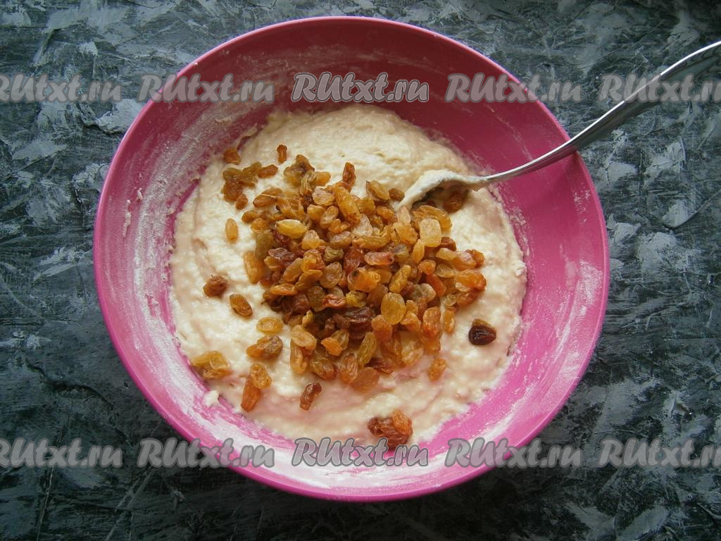 Добавить в тесто изюм.