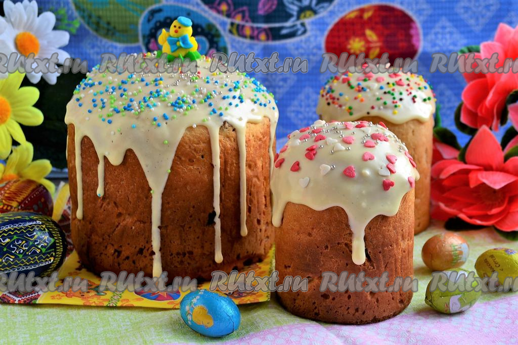 Сразу, пока куличи горячие, покрыть их глазурью и посыпать посыпкой. Оставить до полного остывания куличей и до застывания глазури. Для приготовления глазури смешать до однородности сухое молоко со сгущенкой и лимонным соком. Очень вкусные, воздушные пасхальные куличи готовы!