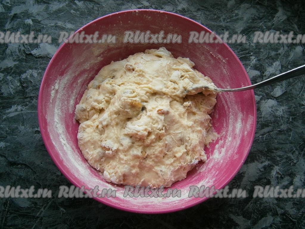 Хорошо перемешать и всыпать оставшуюся муку. Тесто получится довольно густым, его трудновато будет мешать.
