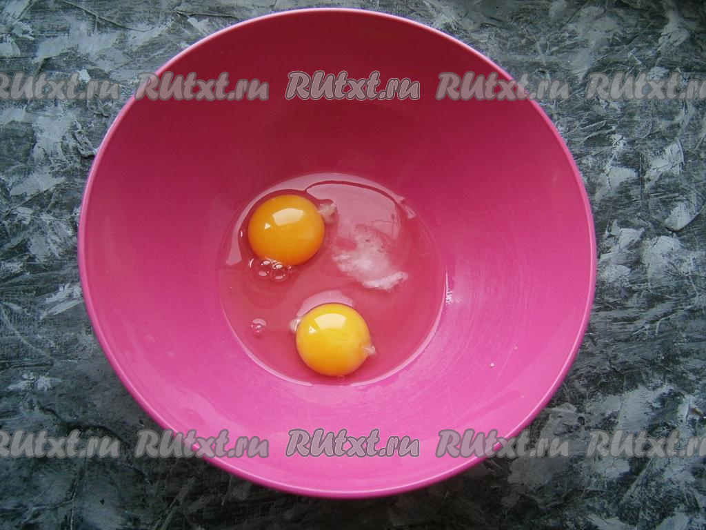 Два яйца разбить в миску, добавить соль.
