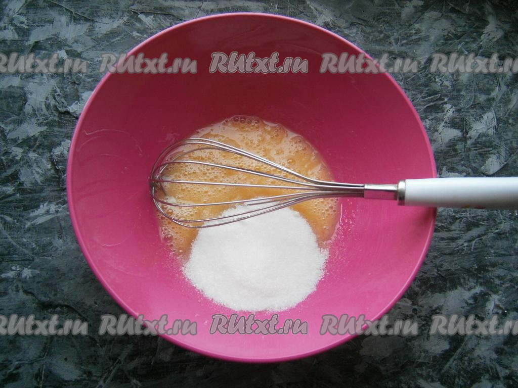 Взбить яйца немного венчиком, всыпать ванилин и оставшийся сахар.