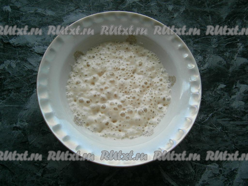 В теплую воду всыпать сухие дрожжи, 1 чайную ложку сахара и 1 столовую ложку муки от общего количества, перемешать и оставить в теплом месте на 10 минут. Дрожжи должны оживиться, появятся характерные пузырьки.