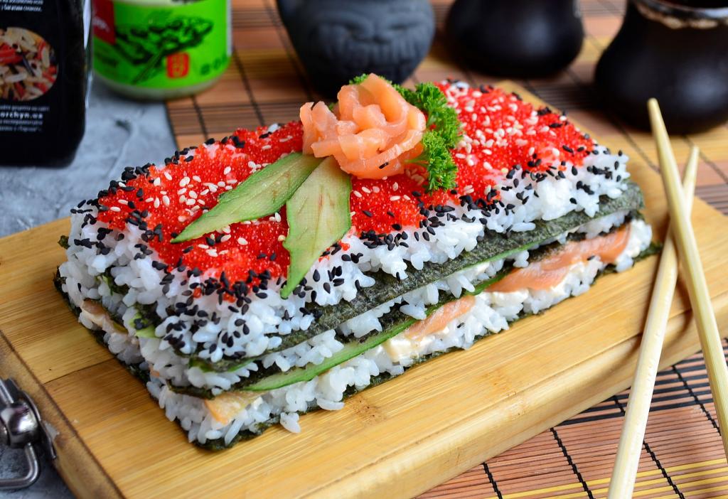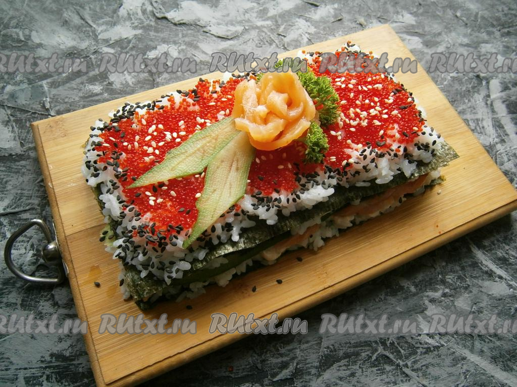 Разрезать такой суши-тортик желательно острым ножом.