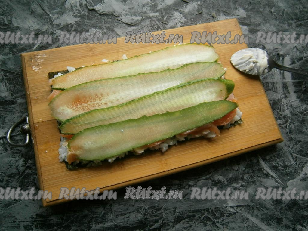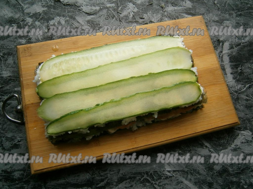 Огурцы промазать немного сыром и накрыть третьим листом нори, на котором распределить оставшийся рис, который сыром смазывать не нужно.