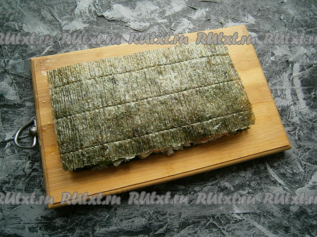 Накрыть вторым листом нори (также шершавой стороной вверх), прижать его.