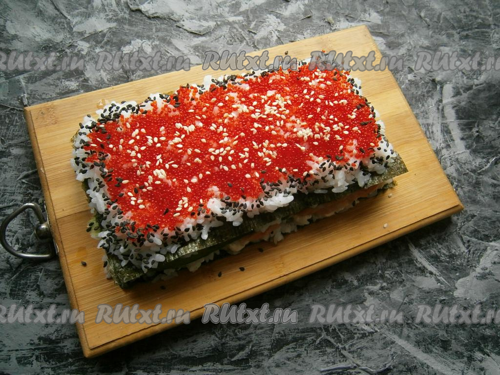 Сверху покрыть торт икрой тобико, не доходя до краев по 1 см. Края суши-торта посыпать черным кунжутом, а саму икру присыпать белым кунжутом.